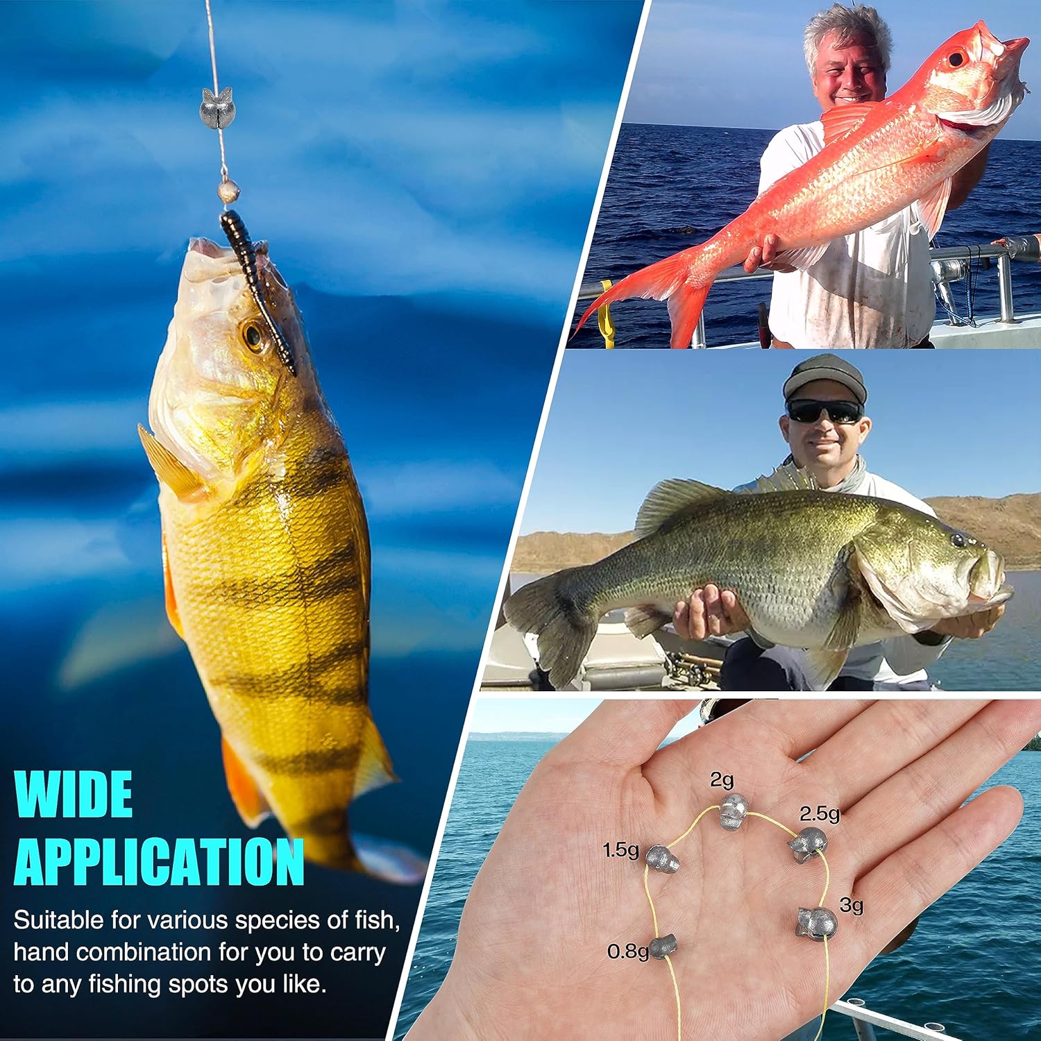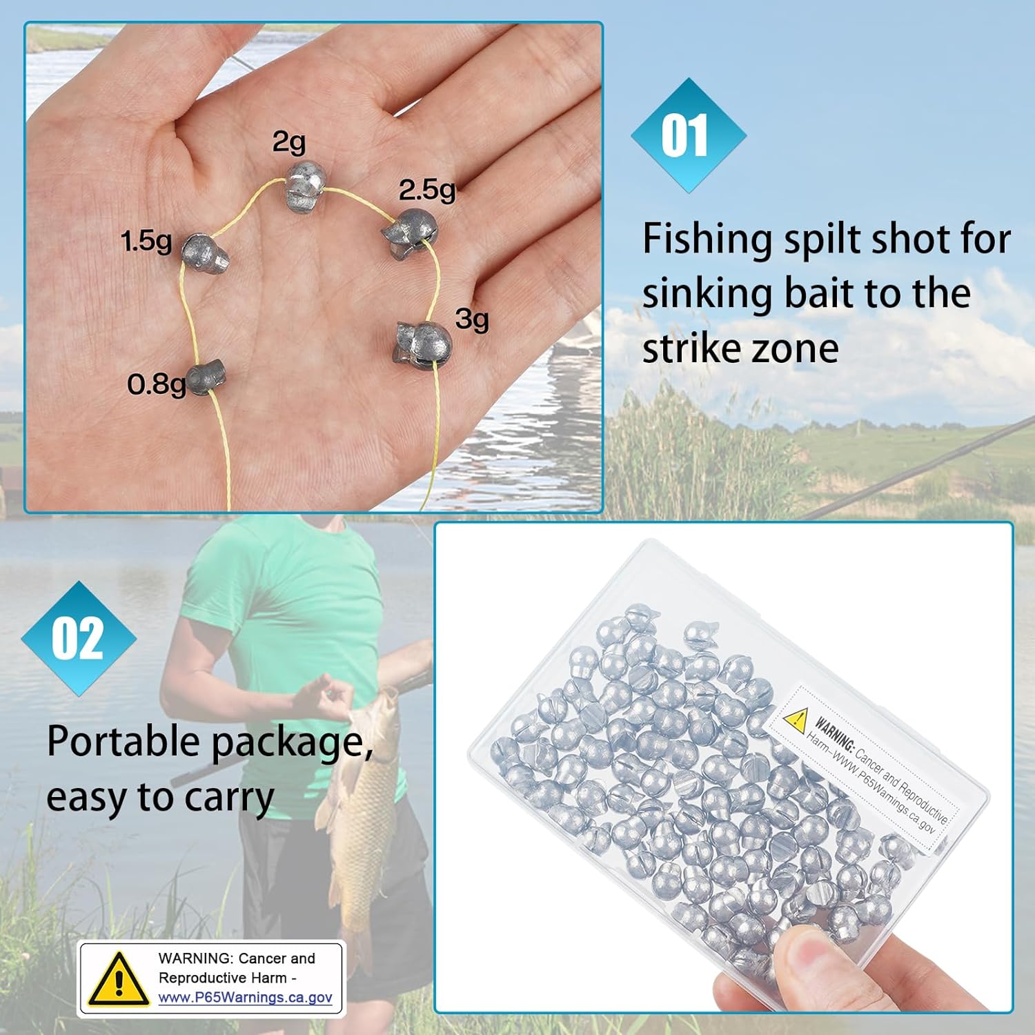 • SPLIT SHOT WEIGHTS: 5 different size to choose 0.028oz/0.8g, 0.052oz/1.5g, 0.07oz/2g, 0.088oz/2.5g, 0.1oz/3g. A variety of sizes will help you to catch different species of fish