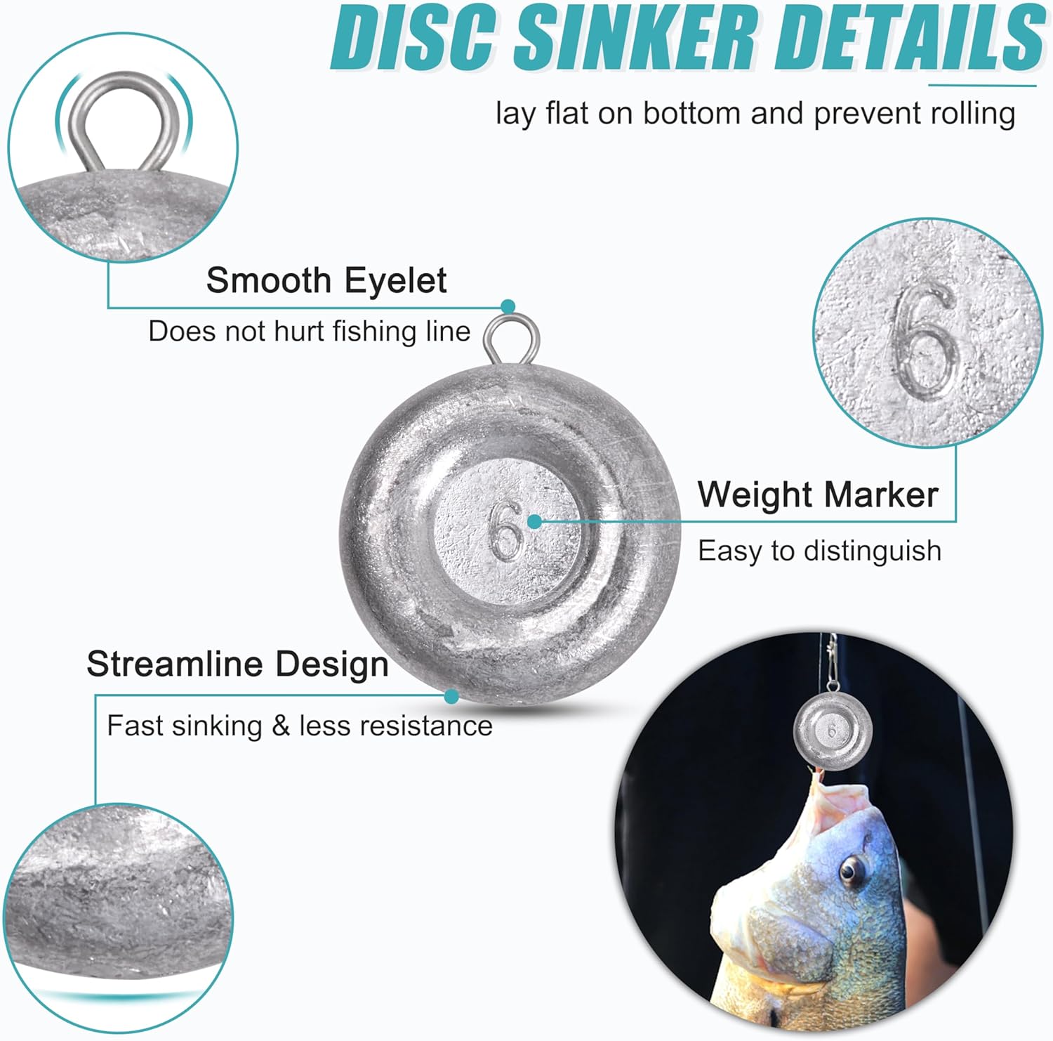STAINLESS STEEL EYELET - The eyelet of disc weight is well -formed and solidly attached to the fishing weights. Smooth and durable, doesn't hurt fishing line. The wire eyes allows to clip easily onto sinker slides